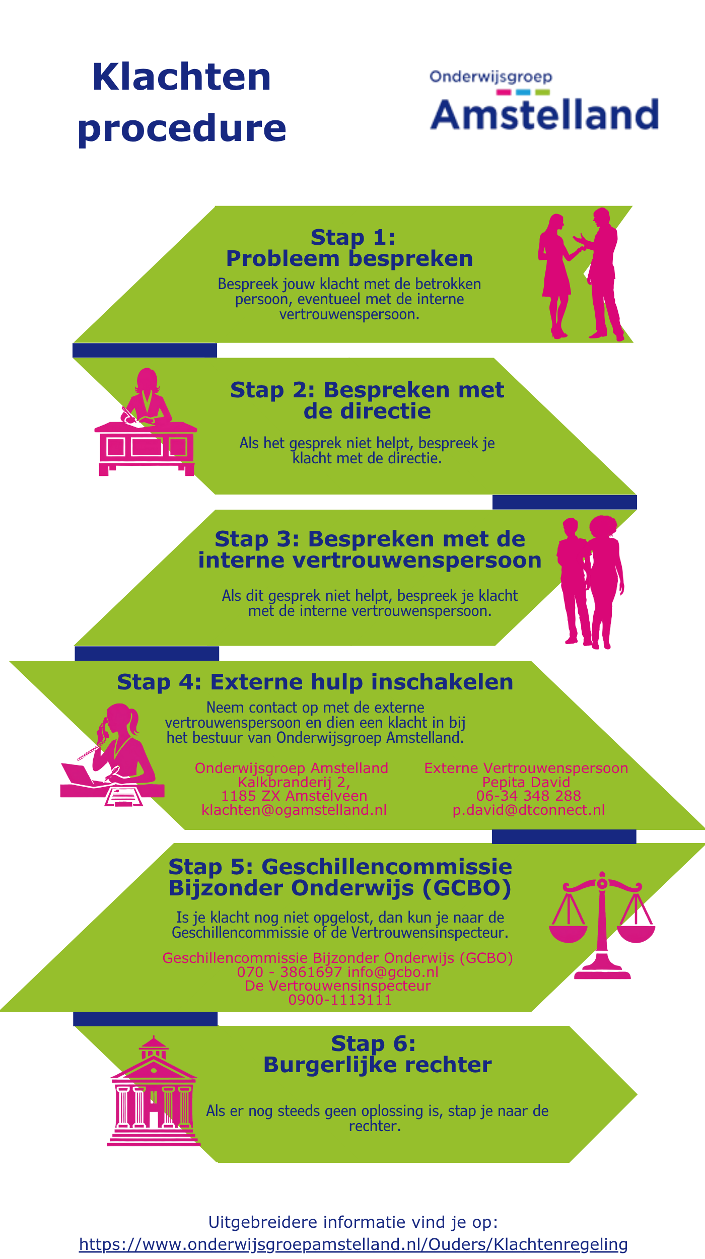 Mocht het bovenstaande niet bevredigend/afdoende blijken te zijn, dan is de klachtenregeling van toepassing. U kunt met uw klacht terecht bij een van de interne vertrouwenspersonen in de school: